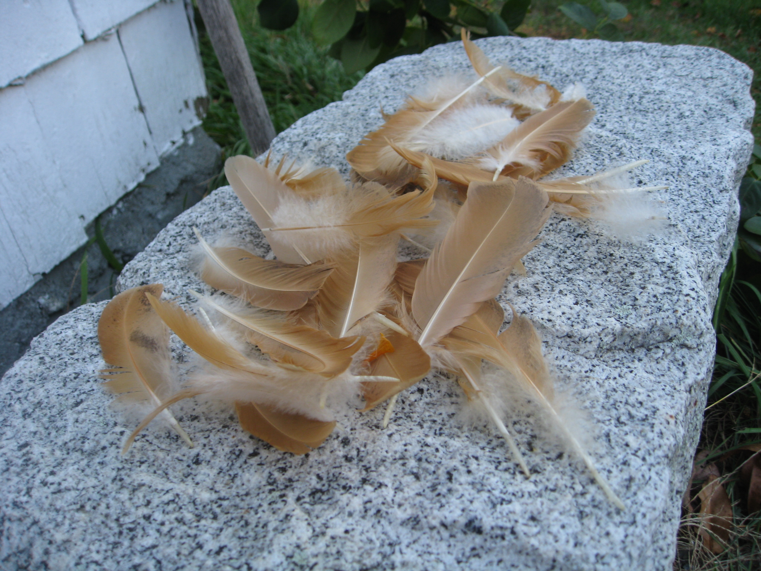 But it was molting that got me to thinking about harvest and history. Their outer feathers have the purpose of keeping rain and dirt away from the body much as a dual coated dog or sheep get with their coarser outer coat. The expression “madder than a wet hen” comes from the fact that if they get wet they are at a greater risk of developing a respiratory disease. Chickens easily succumb to respiratory diseases. So they don’t like wet. The undercoat is soft, downy and keeps them warm. As I saw these feathers around I began to think of what people did in the old days when they were used everything that came their way and wasted nothing. What could I do with feathers that have come my way?