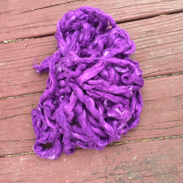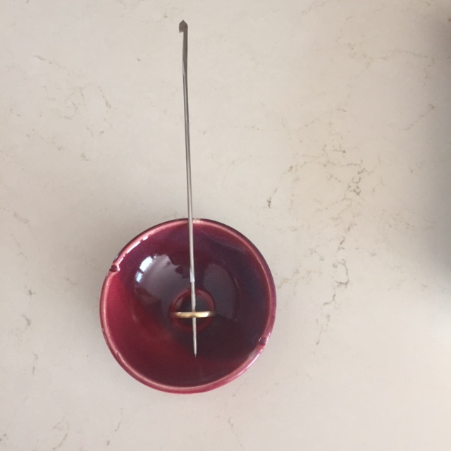 Coincidentally, although I know people who don’t think anything is a coincidence and maybe this isn’t, a few days ago purchase I made from The Woolery http://www.woolery.com, a wonderful spinning and weaving store, arrived. I have been thinking about spinning cotton, and have dyed some that I threw in when dyeing lace for the ring bearer’s pillow for a friend’s daughter’s wedding over a year ago. When I read up on spinning cotton I realized that my wheel would not spin quickly enough which is why Ghandi used a charka which can . Cotton can also be spun on a drop spindle that twirls quickly so I decided to get one. My tahkli spindle arrived with a little bowl in which it will sit as I spin. It weighs half an ounce and is 7″ long.